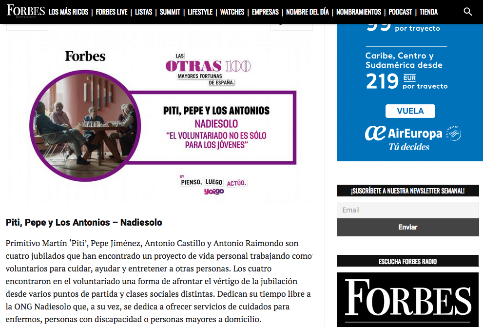 Y en esa lista, Forbes ha incluído a Nadiesolo, a través de la historia de Piti, Pepe y los Antonios, del programa de Acompañamiento en Domicilio, que Pienso Luego Actuo difundió.