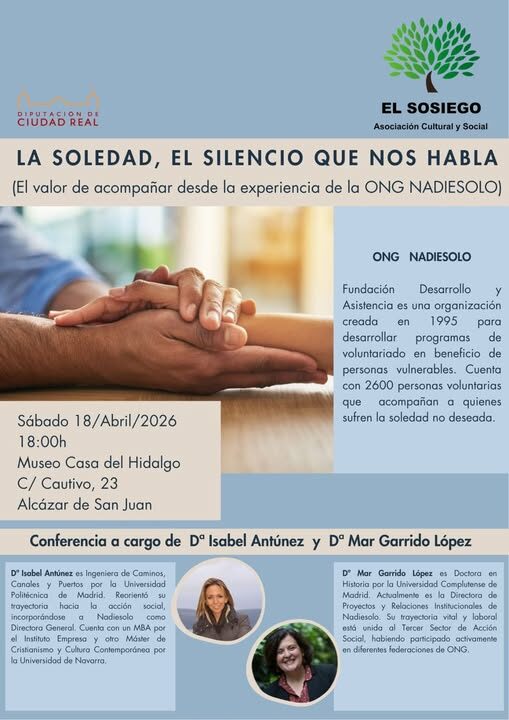 El sábado 18 de abril de 2026, la asociación El Sosiego de Alcazar de San Juan organizó una conferencia para abordar una de las realidades sociales mas relevantes de nuestro tiempo: La soledad no deseada.