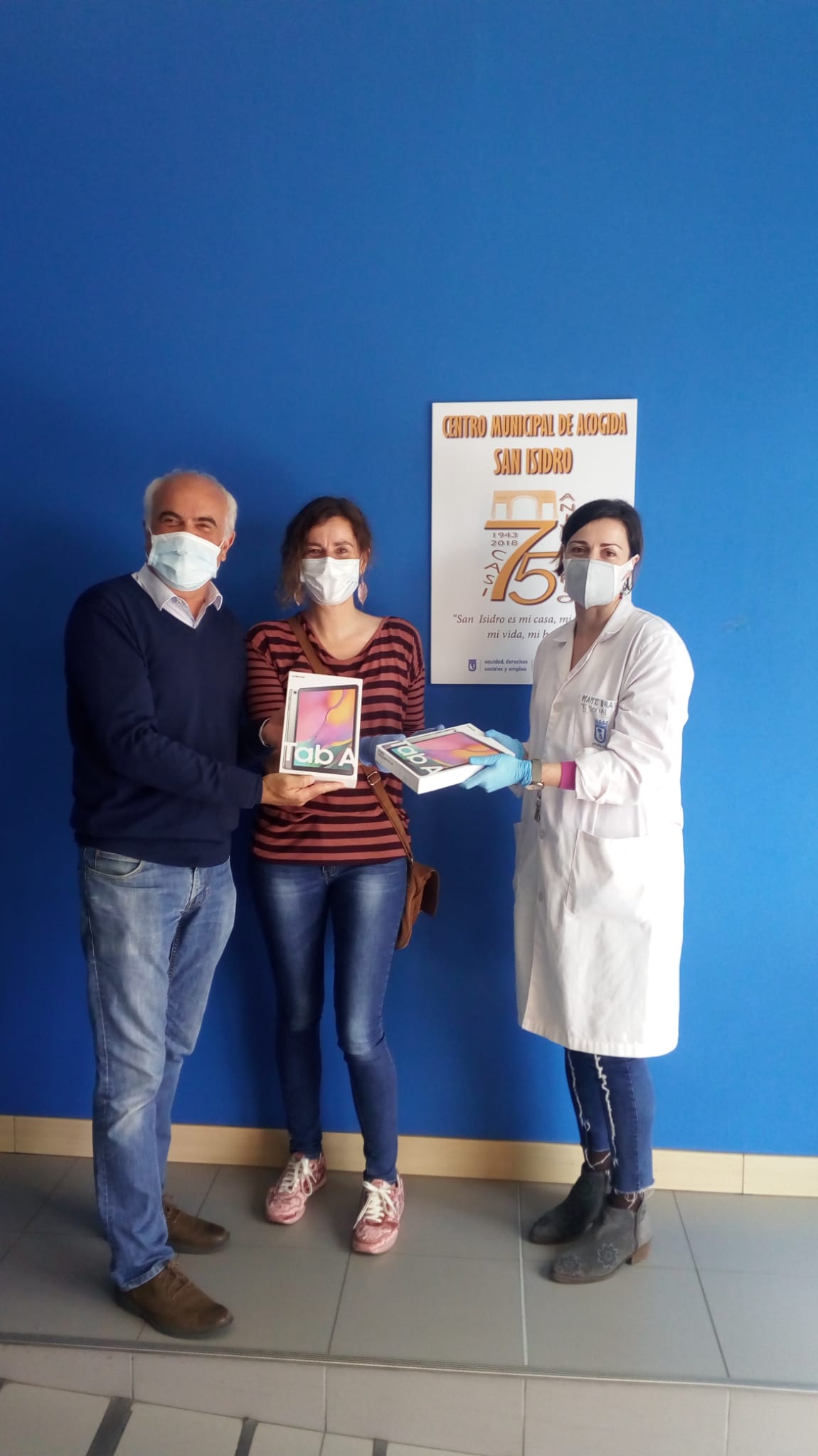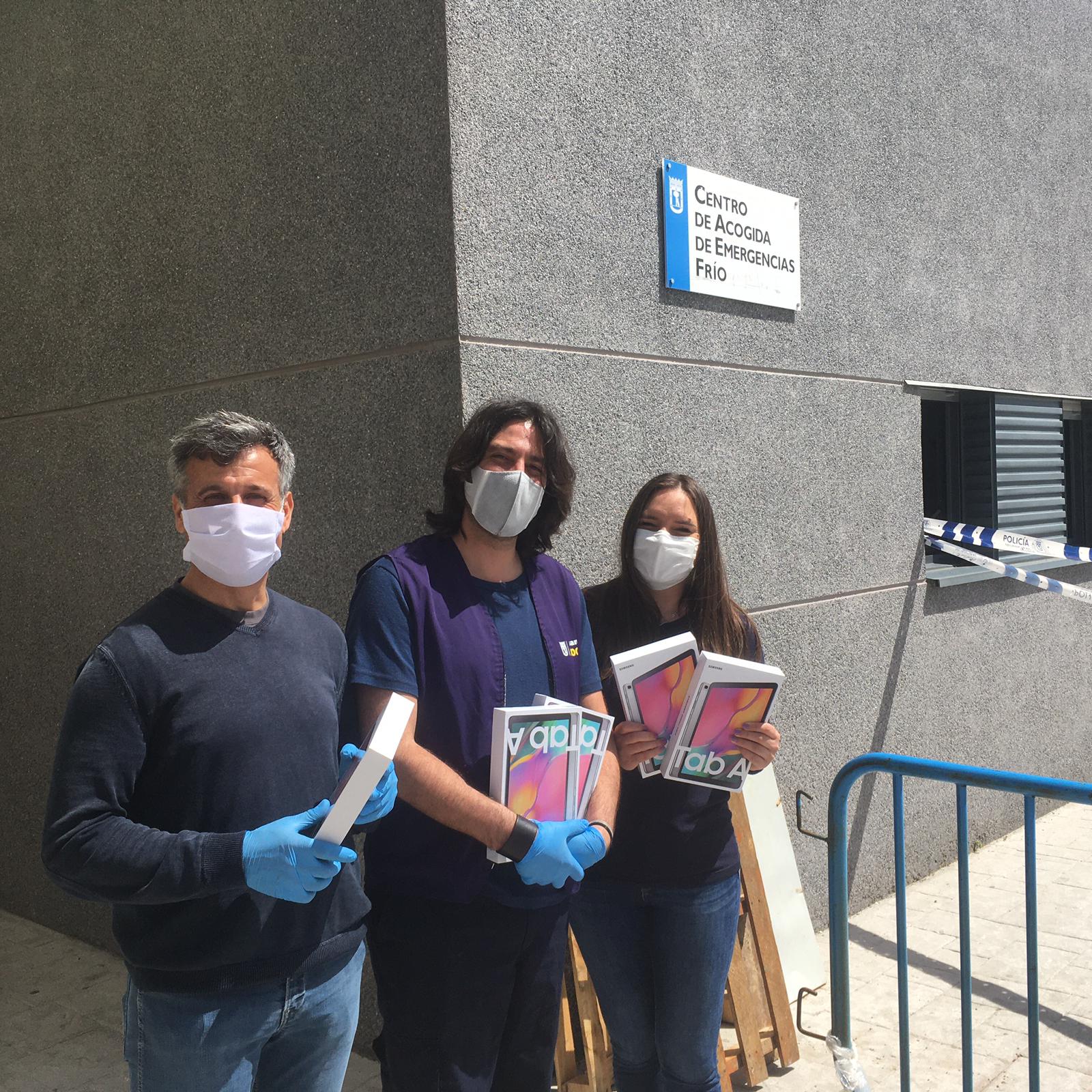 - Magu y Rosa, voluntarios de nadiesolo, entregan las tablets a Mayte Bravo, Jefa de Sección del Centro de Acogida San Isidro.